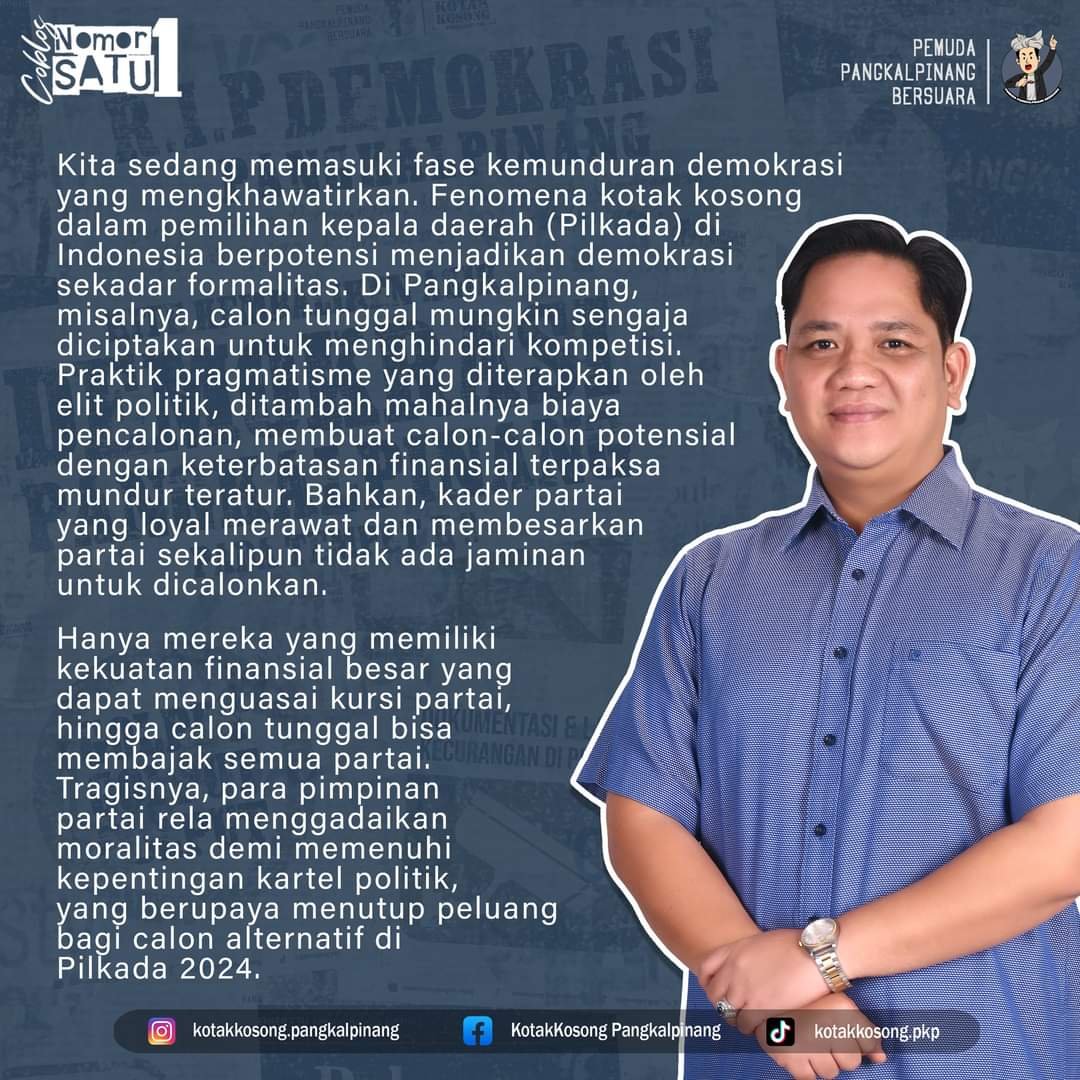 Sementara itu, salah satu tokoh masyarakat kota pangkalpinang Badarudin Usman mantan Ketua DPRD Kota Pangkalpinang mengapresiasi inisiatif yang dilakukan oleh simpul relawan kotak kosong ini.