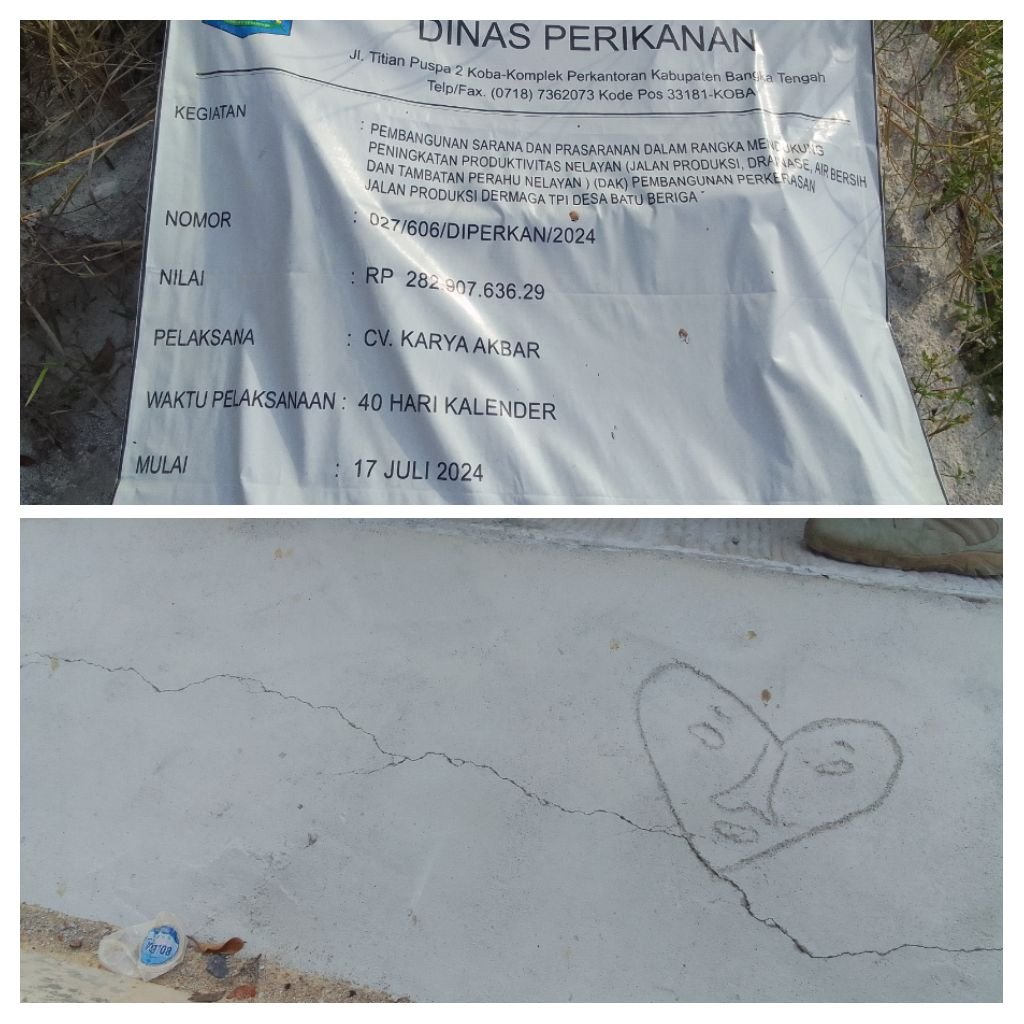 Proyek pembangunan jalan produksi di Dermaga TPI (Tempat Pelelangan Ikan) Desa Batu Beriga, yang menelan anggaran sebesar Rp 282.907.636.29 menuai sorotan dana dari dinas perikaan kabupaten Bangka tengah.